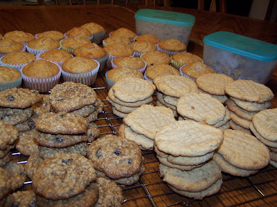 I baked 29 banana muffins, 3 dozen oatmeal raisan cookies and 3 dozen peanut butter cookies. I also have a container of each kind of dough to put in the freezer.