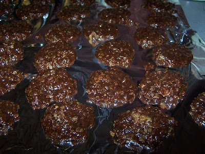 Put first four ingredients in pan. Boil for 1 and 1/2 minutes. Remove from heat, then add the remaining ingredients. drop by spoonfuls on waxed paper and cool.