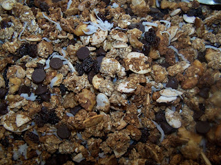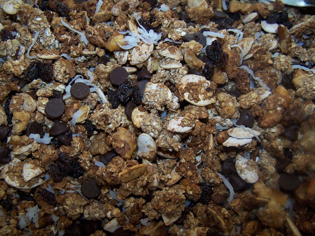 After cooling, stir in the raisins, coconut and chocolate chips. Store in an airtight container.