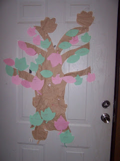 The kids Thanksgiving Tree on the front door. Yes, a girl made the leaves this year! |