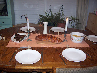 You can also see the beautiful loaf of challah bread my daughter made. I started out making the challah earlier this year, but she has taken over. She has learned how to make 6 braided challah. Beautiful and tastes great. We use pieces of challah for the communion bread, and grape juice in our cups.