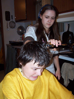 My daughter has expressed an interest in cutting hair, so when we cut all the guys hair the other day, I let her help. Here she is doing her older brothers hair. This was her first haircut. Do you think he looks scared? lol