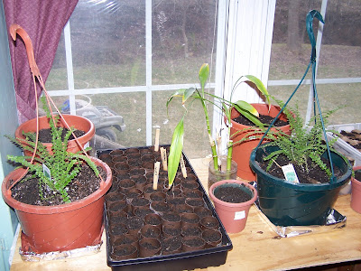 This week, I tackled getting some of our seeds planted. I still have quite a few things to start from seed, but I ran out of potting soil. 20 pounds worth! I also repotted three Lemon Button Ferns. The plan is, by spring they will be nice and big to hang on the back porch. Those big ferns are so expensive in the spring! All the other conainers, where you see just dirt, 🙂 have been planted with seeds, lavender, sage, feverfew, oregano, basil, anise, cherry tomatoes, roma tomatoes, beefsteak tomatoes, bell peppers, cabbage, broccoli. Lots and lots of them! I still have more cabbage to start, as well as more tomatoes, after I get more potting soil.