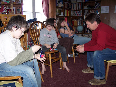 The kids lined up chairs, or um… pews… and we sat in the schoolroom and listened. The schoolroom was closer to the radio, which was in C’s bedroom.