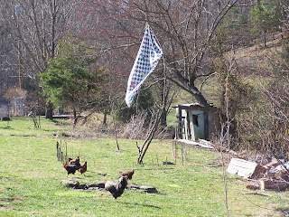 A & Z have been enjoying the warm weather, playing outside a lot. The built themselves a fort of some kind. Including putting up a flag. The chickens seem to be enjoying it, too.