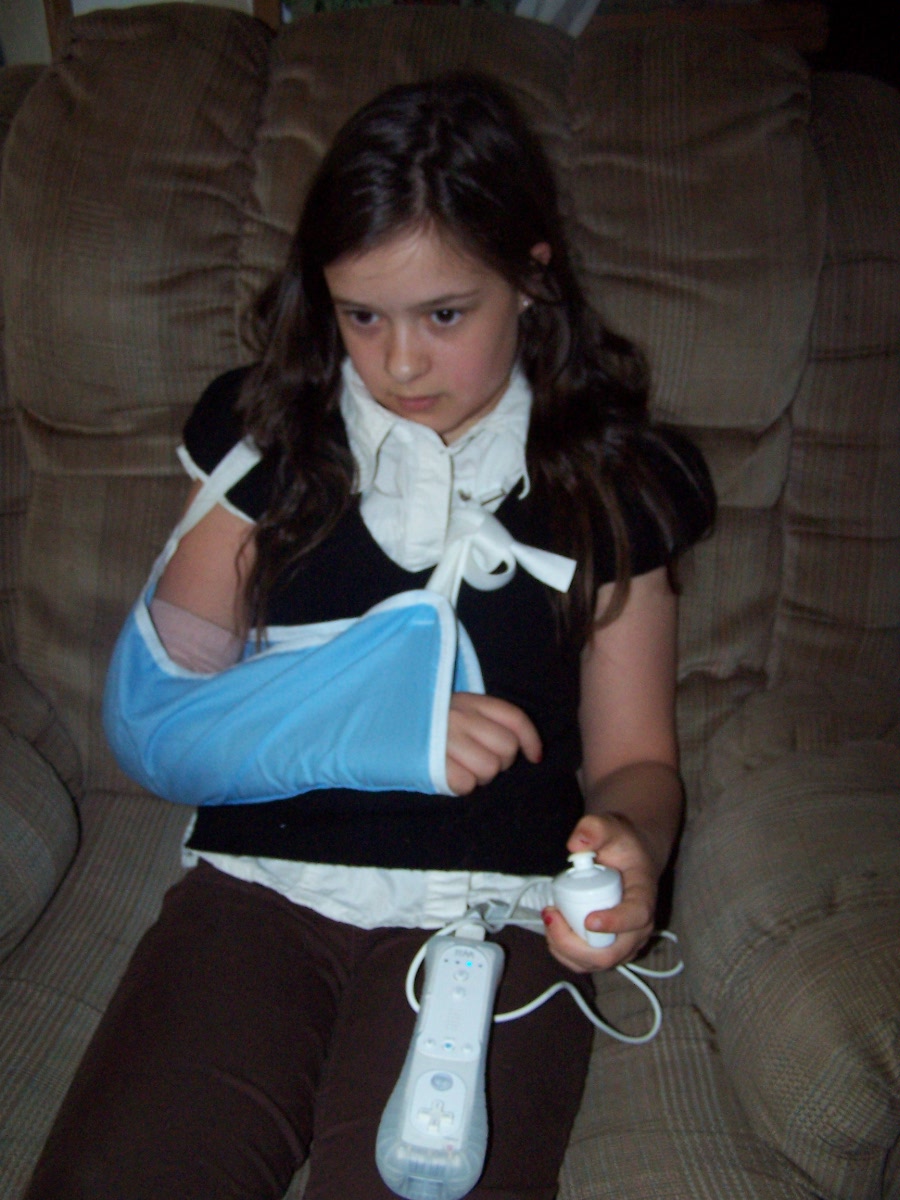 She wrapped it, put on a sling, and told Abby not to use her arm, hand or even her fingers, until she sees the doctor tomorrow. Which is today. She can’t even hold a pencil until he decides if he wants to splint it, cast it, or send Abby to see an orthopedist.