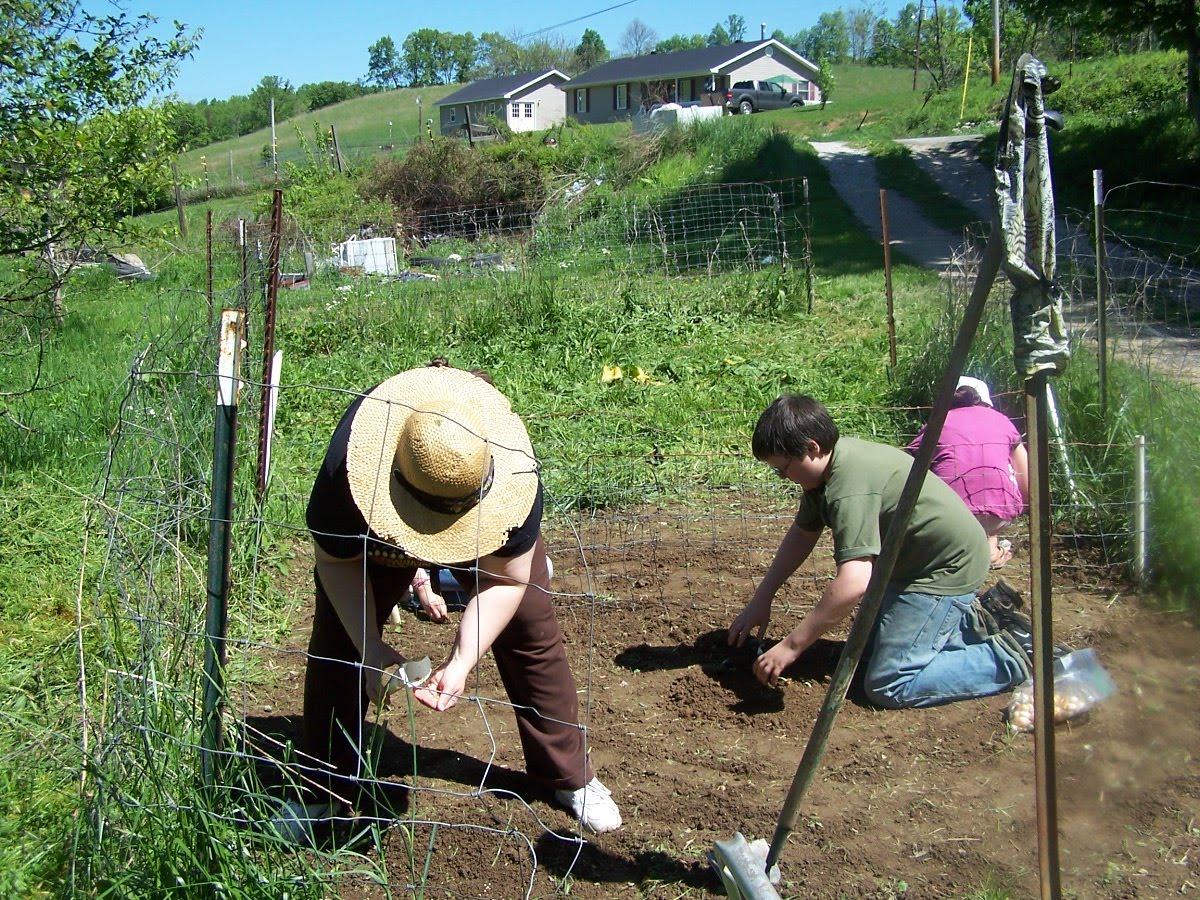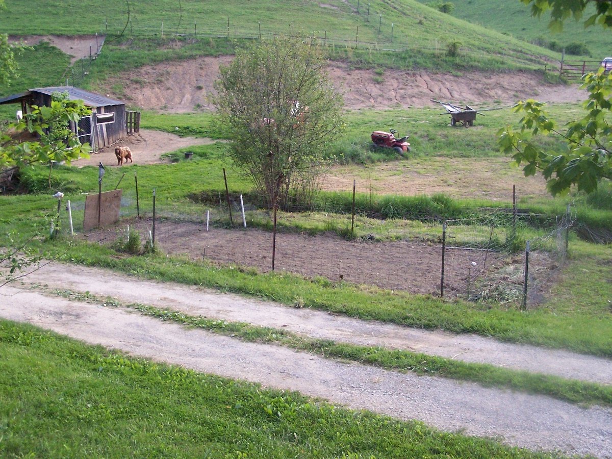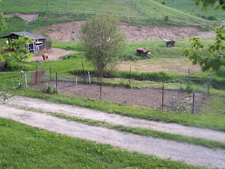 This is a picture of the garden taken from the road. We still have work to do over on the left where we grown yellow squash, zucchini, pumpkins, and anything else that takes up a lot of room. On the other side of the creek, we have asparagus, comfrey for the animals, and we will plant our corn over there, too. We have to finish planting the front garden, too!