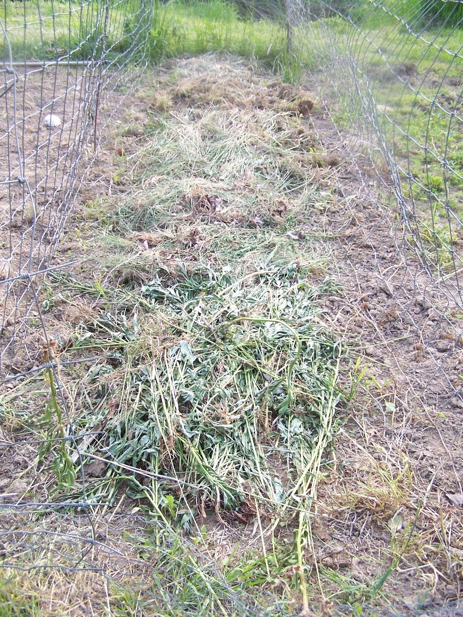 We grow green beans on these two fences. We like to use grass as mulch between the rows. If the grass clippings are at least 6 inches deep, it won’t grow, but it will keep the weeds from growing.