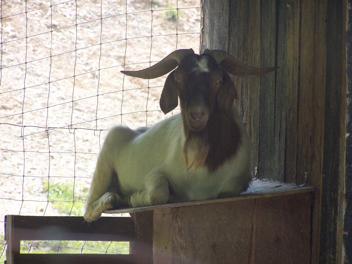 Meet Samson our male Boer Cross goat. He’s laying on top of the hay trough. I don’t how that thing holds him up, because he’s big.