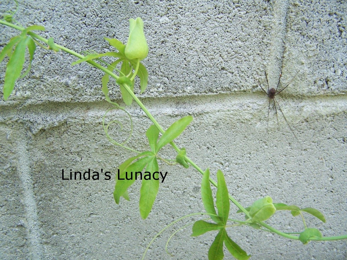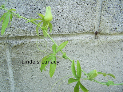 The Passion Flower that I trimmed and moved outside is growing like crazy. I found 2 buds. Oh, and a long legged friend.
