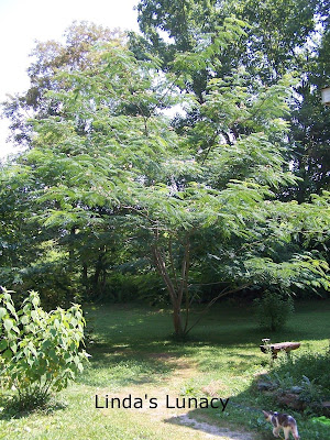 Last week, I shared a picture of a mimosa blossom. Now here’s the tree. It’s so huge, and provides a lot of shade for this end of the yard. There are still blossoms on the tree, but you can’t see them in the picture.