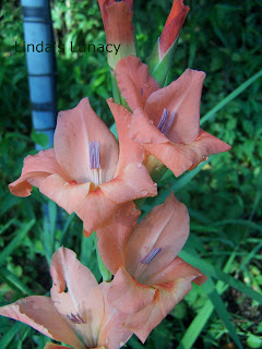 The glads in the front garden are blooming this week. These are a really pretty salmon color.