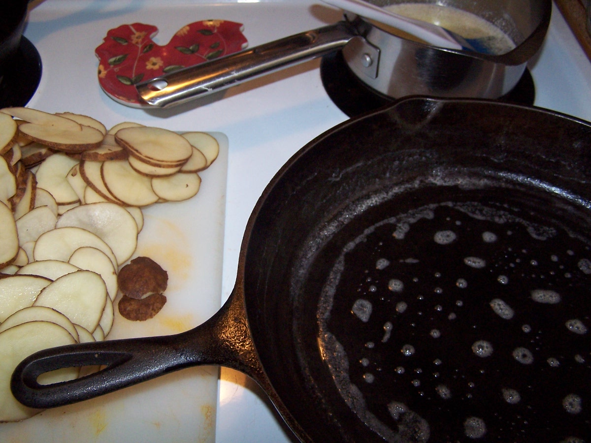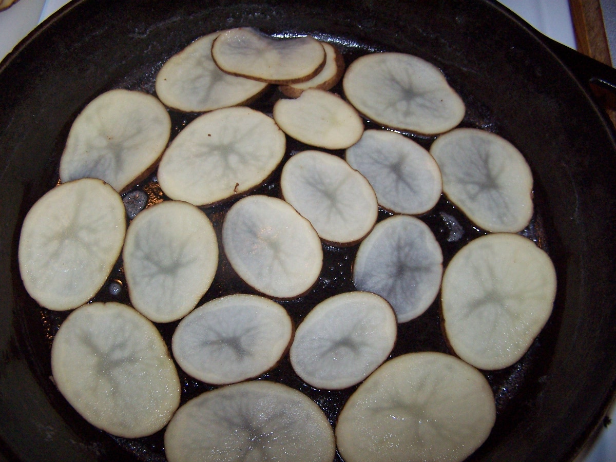 Brush melted butter on bottom & sides of skillet. Layer potatoes in circles in pan.