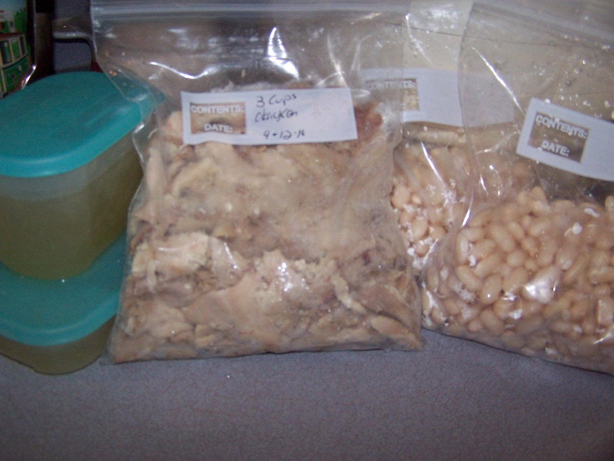 I had never made White Chicken Chili before, but while looking through The $5. Dinner Mom Cookbook, I saw her recipe that looked simple. I made a few changes, though. Since I wanted to use food from the freezer, and we don’t use the diced chili’s the recipe called for. And, of course, I had to make a larger amount. lol This is a very quick recipe to put together when using the broth, chicken and beans from the freezer. Here’s what I did: