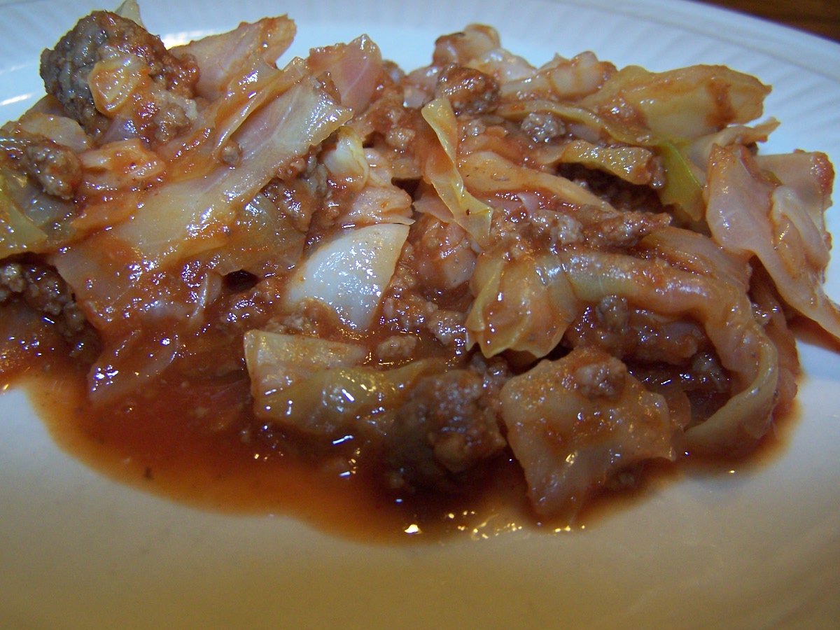 Brown the ground beef with the cabbage. Drain. Pour over 1 can of tomato sauce, and add 1 tbsp. chili powder. Let simmer 15-20 minutes. Serve.