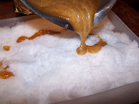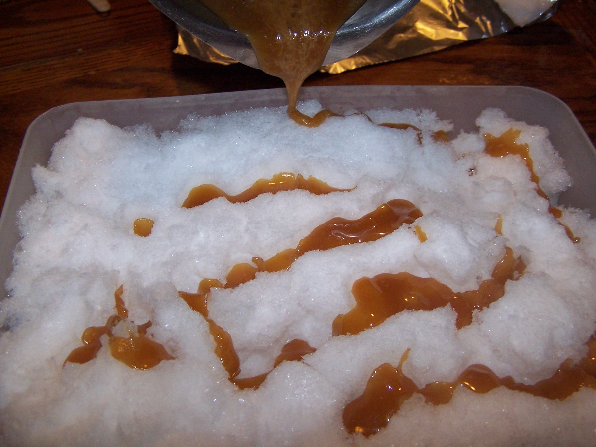 Place snow in pan or bowl, and drizzle hot syrup over snow. The snow cools the candy pretty quickly. As soon as the candy is cool enough to eat, it’s ready.