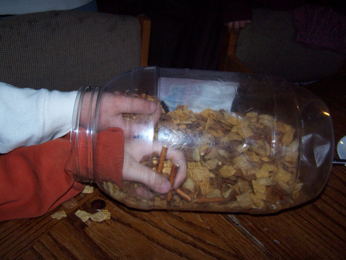 That is too funny. I'm sure they weren't all that amused though. How long did it take them to figure out they should let go of the Chex Mix and put their hands in one at a time?