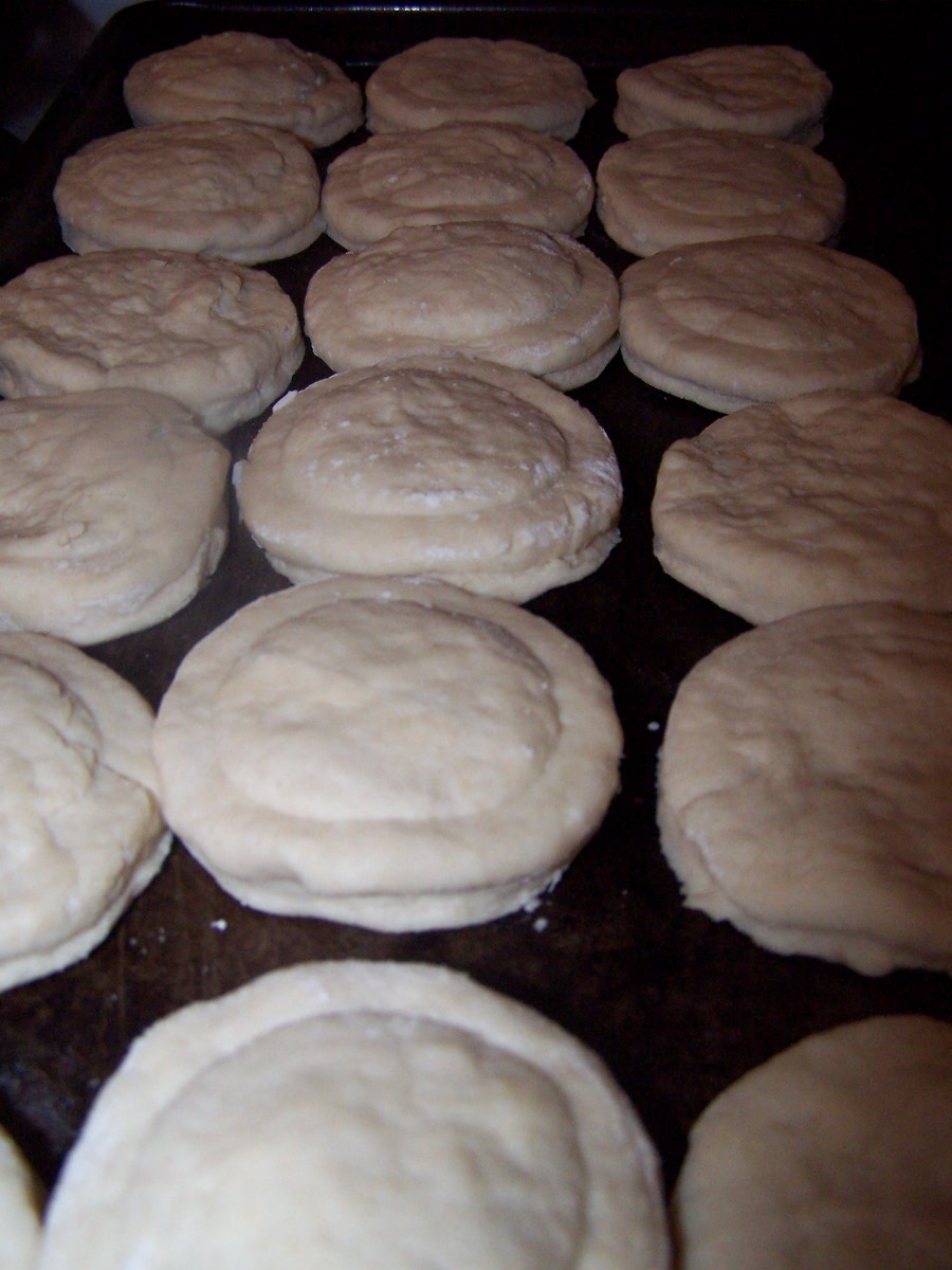 Pat dough out until 1/2 inch thick. Cut dough using a biscuit cutter or you can use a glass dipped in flour to cut the biscuits.
