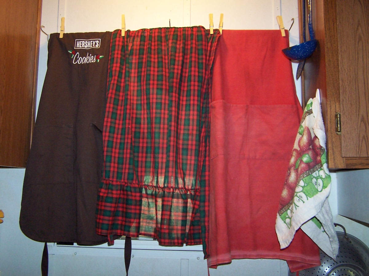 Oh, I could have rushed out and bought some aprons to use. Or bought fabric to make some. That, however, would not be good for my family. We can use the money elsewhere, instead of on curtains, just because I felt like changing them. I really do love the old curtains that I made, so I can in no way justify buying new.