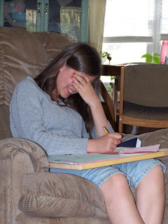 Here’s Abby studying her Bible Drill. You can see the top of her tree in the dining room window.