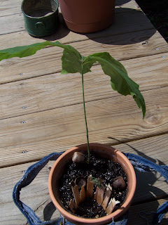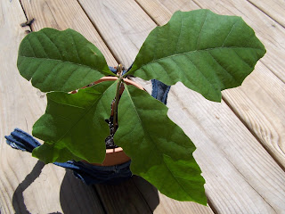 A couple of months ago, while out on a walk, Abby brought home an acorn to plant. She planted it in a flower pot in the dining room. Here’s what it looks like now.