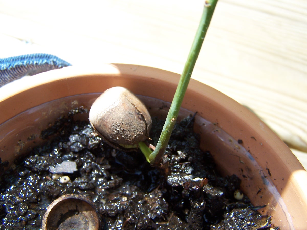 It grew out of the acorn, cracking the shell. Look at the big leaves.