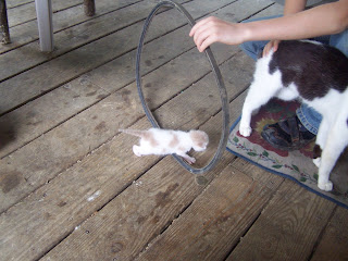 I found this picture on the sd card. They are training the kitten to walk through a hoop. There are other pictures before and after this one, and the kitten really walks through on its own. Too funny.