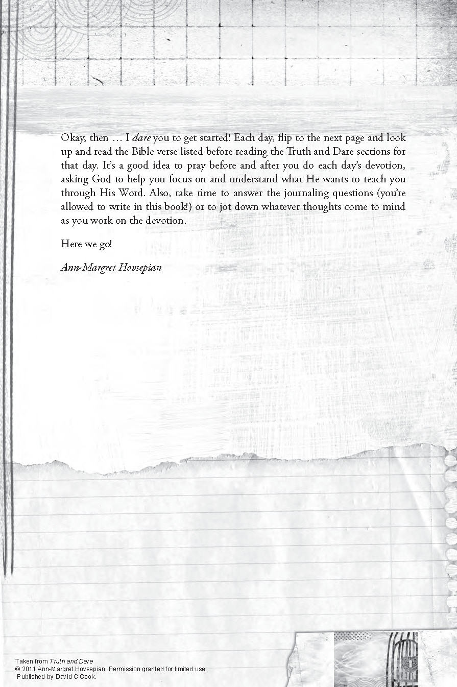 Is your pre-teen daughter ready for more—more excitement, more adventure, more joy? Then dare her to discover the secret to a life that sparkles for God. Show her she’s got what it takes to make an impact on the world. Ann Margret Hovsepian’s newest book, Truth and Dare: One Year of Dynamic Devotions for Girls, is designed for girls 9 to 12 and filled with powerful wisdom on everything from godly friendships to worshipping God.
