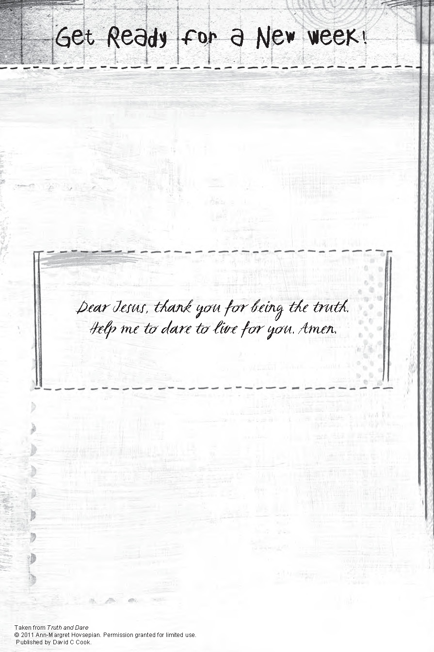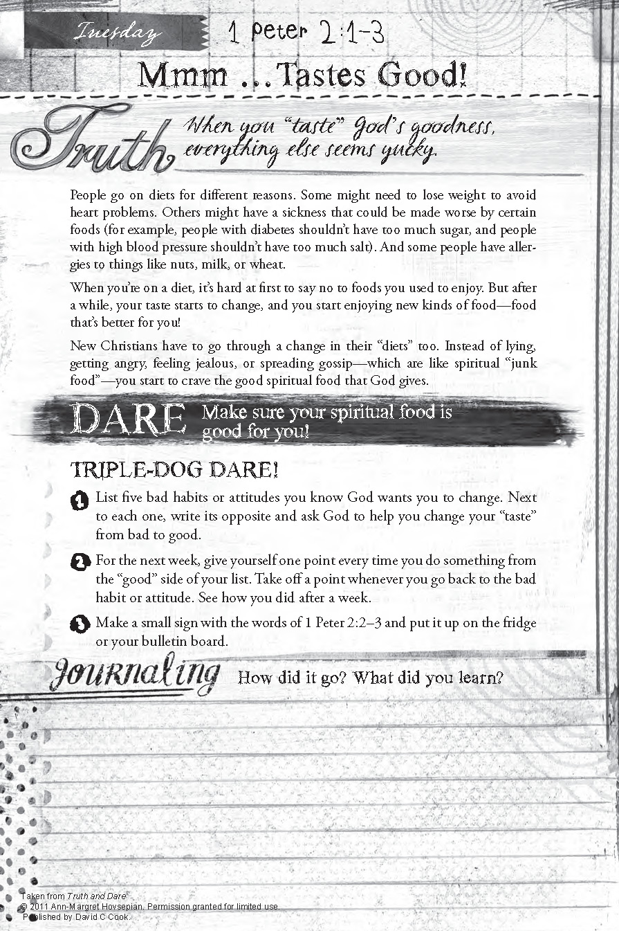 Truth and Dare encourages tween girls to discover how exciting God’s Word can be. They will see it make a difference in their daily lives and experience the blessings that come from doing it and not just hearing it. Daily challenges (dares) based on Scripture (truth) will provide opportunities for them to make their faith come alive as they learn to serve others, build character and make a difference.