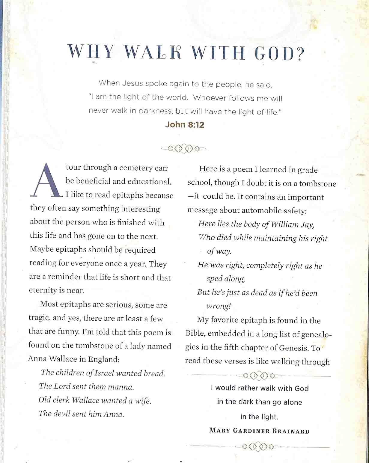 This epitaph is perhaps one of the most beautiful phrases in the entire Bible. If it could be said of you and me that we “walked with God,” nothing more need be said. Those few words contain an eternity of meaning.
