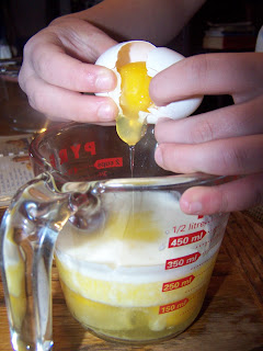 - Drop 2 eggs into melted shortening. Fill to 1 cup with milk.