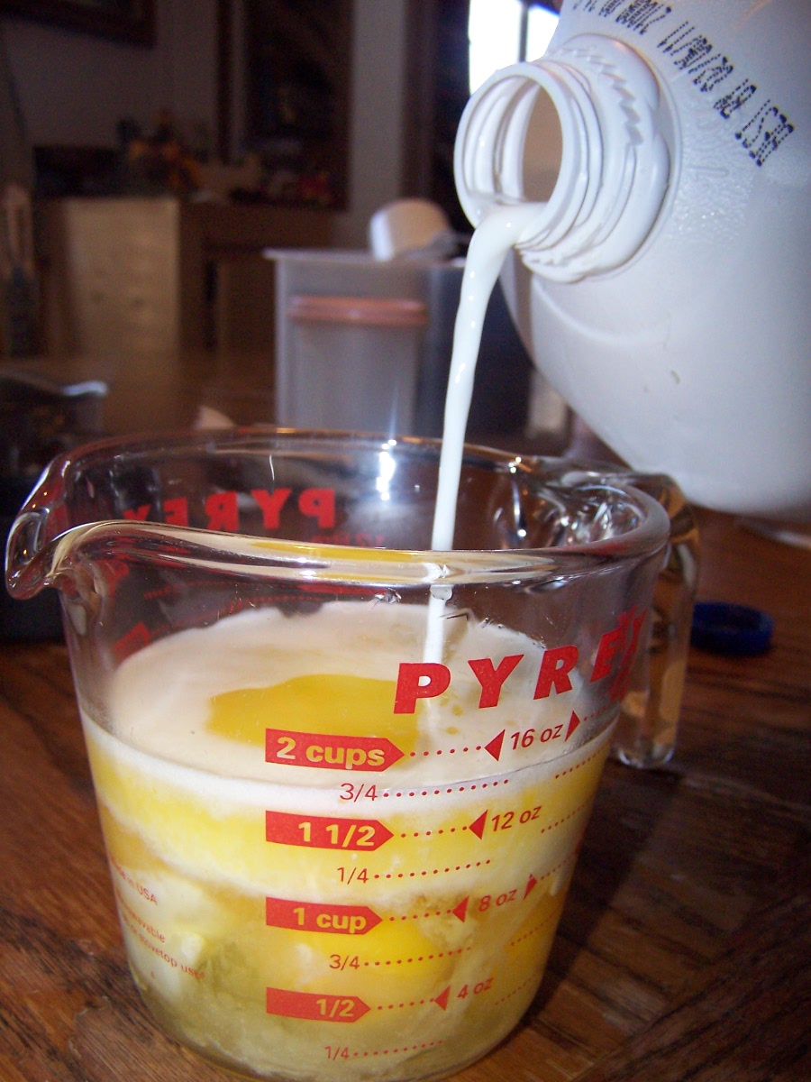 Fill to the 1 cup mark with milk. ( In these pictures, I doubled the recipe, that’s why I’m filling to the two cup mark) Mix thoroughly.