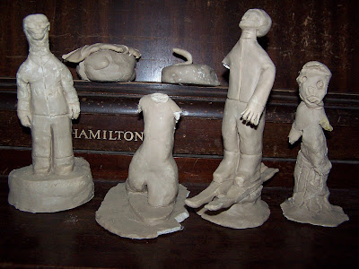 We made the above statues out of clay for the 2002 winter olympics. A & Z were really little, A made a snowboard on a snowpile, and Z made a curling rock. Hey, he was 2! lol One statue already lost its head.