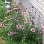 I just love the Echinacea flowers. The next picture is taken from my front porch, looking left. You can see the small purple Butterfly Bush (small being relative, it's taller than me, but smaller than our big white bush), 2 Hibiscus - one pink and one white, branches from the Mimosa tree, and some Hostas on the lower left. The picture is … [Continue]